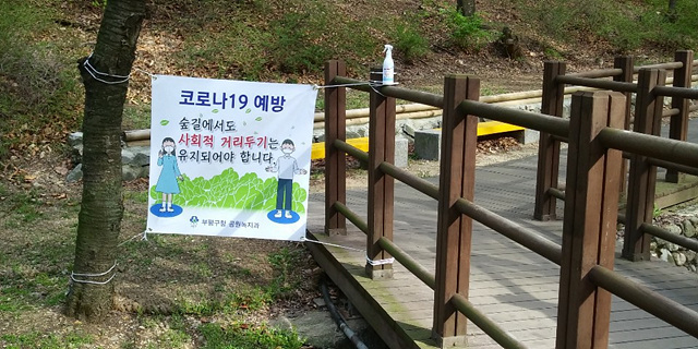 구는‘인천시가 과잉 대응하면 시민은 더 안전하다’는 인천시의 대응 기조에 따라 지난 달 22일 장수산 등 7개산 주요등산로 20곳에 사회적 거리두기를 권고하는 현수막을 게시하고 손소독제를 비치했다.