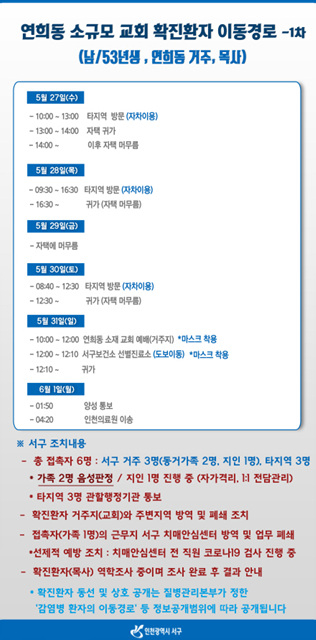 서구 연희동 소재 가족중심 교회의 목사인 A씨(남성, 53년생)가 6월 1일 새벽 코로나19 확진 판정을 받았다.서구 16번째 확진환자다.