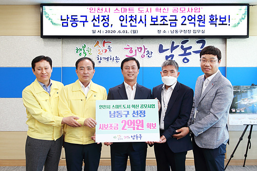 이강호 남동구청장은 1일 집무실에서 인천시'시민 체감형 스마트도시 서비스 시범 공모사업’선정 및 市 보조금 2억 원 확보와 관련해 관계자들과 기념 촬영했다.