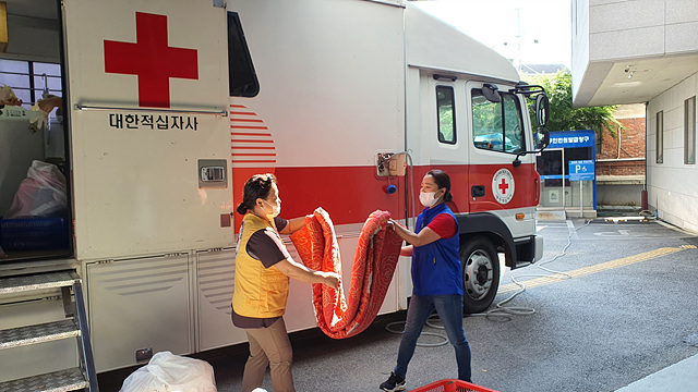 계양구 계산1동은 지난 29일 계산1동 보장협의체와 적십자사 한사랑봉사회가 계산1동 행정복지센터 주차장에서'사랑의 이불세탁 봉사’를 실시하였다.