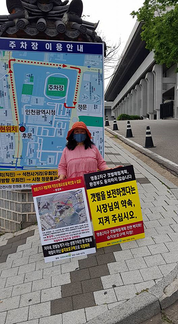 문경숙 인천녹색연합 이사가 인천시청 후문에서 갯벌 매립 더 이상 안됩니다. 생명의 땅 갯벌! 미래세대에게 물려 주어야 할 소중한 자연유산으로 반드시 지켜내야 한다,며 릴레이 1인 시위에 참여했다.ⓒ 인천시민기자단 단장
