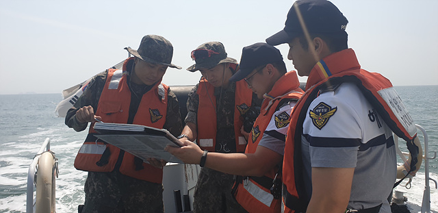 ⓒ지난 9일 육군 17사단에서 실시한‘유관기관 통합 전제대 동시 수색정찰’간 사단 장병과 해경이 해경정에 탑승하여 수색정찰중에 있다.