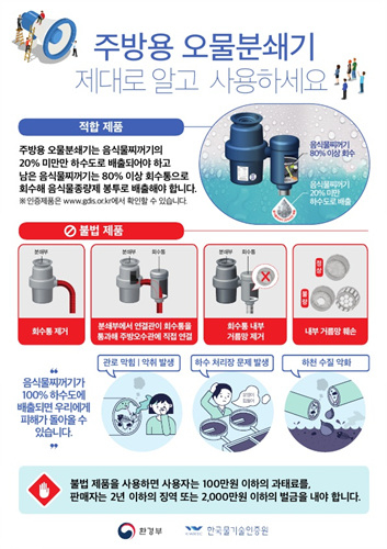 정부는 환경부 장관이 인정한 국가 공인 시험기관으로부터 품질 인증을 받은 오물분쇄기만 일반 가정에 한해 판매·사용이 가능하도록 엄격히 규정하고 있다.