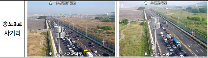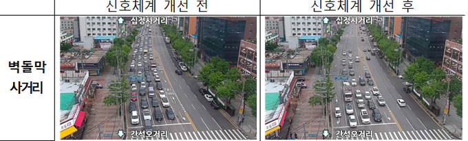 인천경찰은 이러한 정체를 해소하기 위해,벽돌막 사거리의 ▲신호주기 상향(180→190초) ▲직진차로 추가와 우회전 전용차로 증설을 추진하고,송도3교 사거리는 ▲ 좌회전 시간 축소 ▲신호주기 상향(170→180초)을 추진한 결과,벽돌막과 송도3교 사거리의 지체도가 각각 68.5%(710→224초), 81.0%(594→113초) 감소했다.