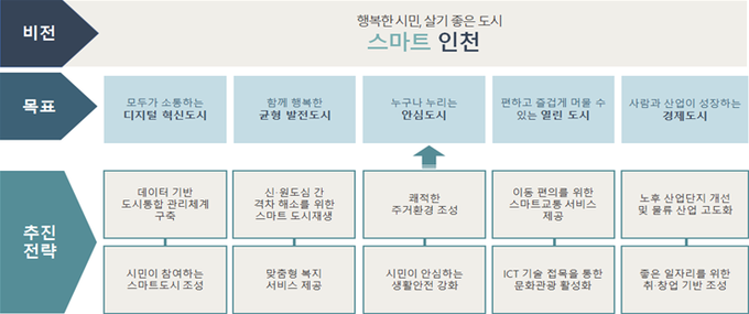 인천시는 글로벌 기후 변화 및 도시화에 따른 자원/인프라 부족, 교통 혼잡,에너지 부족 등 각종 도시문제를 효율적으로 해결하고 4차 산업혁명 관련 첨단 ICT기술을 활용하여 스마트도시를 조성하기 위해 중․장기 계획인‘인천시 스마트도시계획’을 수립했다.