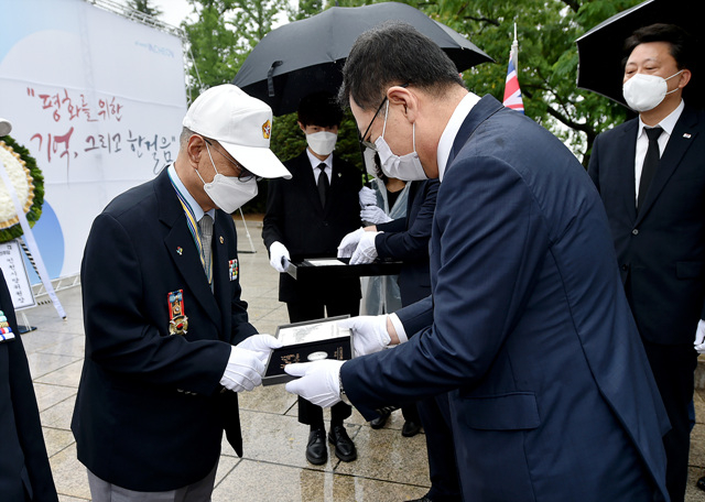 참배 후 자리에 함께한 6.25참전유공자회 인천시 지부장 등 회원에게 6.25전쟁 70주년을 기념하여 참전유공자의 희생과 헌신에 대한 감사의 마음을 전달하고자 제작(국가보훈처)한 감사메달을 전달했다.