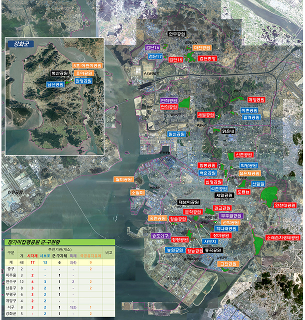 시는 작년 2월 ‘인천광역시 공원확충계획’을 수립하고, 총 5,641억원의 사업비를 투입해 2022년까지 48개소 6.18㎢의 공원 조성을 목표로 세웠다.▲ (재정+특례) 당초: 46개소 2.91㎢ → 변경: 48개소 6.18㎢