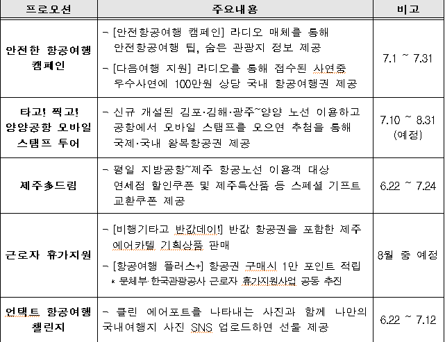 이밖에도 8월부터 문체부, 한국관광공사와 함께 근로자를 대상으로 반값 항공권과 에어카텔 기획상품을 제공하는 '비행기타고 반값데이!' 프로모션 등을 진행한다.