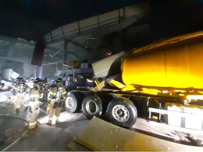 22일 인천소방본부에 따르면 에스티케이케미칼 입구에서 과산화수소와 수산화나트륨 혼합물을 탱크로리에 옮겨 싣던 중 혼합물이 폭발(추정)해 공장 일부 벽면이 붕괴됐다.