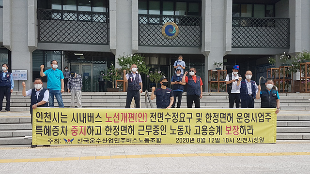 전국운수산업노조 박상천 위원장은 12일 오전 10시 인천시청 본관 앞 게단에서 시내버스노선개편안 수정요구와 한정면허운영사업자 특혜중지, 한정면허 운전직 노동자 고용승계를 촉구하는 기자회견을 진행했다.