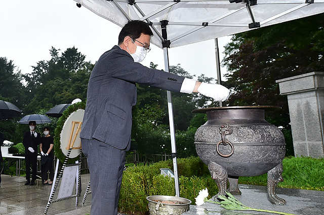 ▲ 박남춘 인천시장이 제75주년 광복절을 맞아 수봉공원에 헌화를 하고 있다. ⓒ 인천시 대변인실