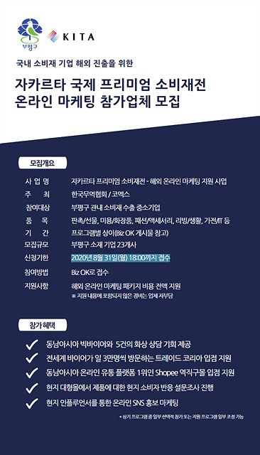 구는 한국무역협회와 코엑스가 주최하는 ‘자카르타 국제 프리미엄 소비재전’ 참여를 희망하는 지역의 소비재 수출 중소기업들에게 해외 온라인 마케팅 비용 전액을 지원한다는 계획이다.