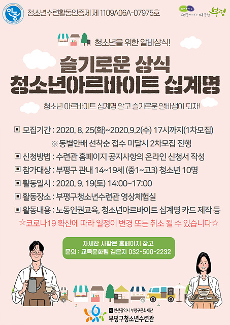 부평구청소년수련관은 오는 9월 19일 토요일에 관내 청소년을 대상으로 청소년수련활동인증프로그램‘슬기로운 상식 청소년 아르바이트 십계명’을 진행한다.