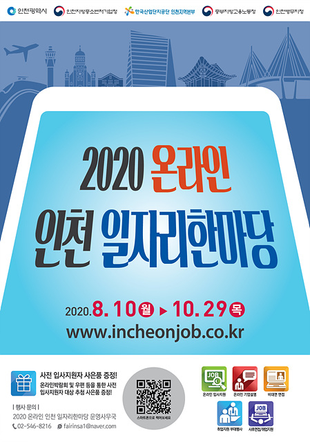 인천시와 인천지방중소벤처기업청,한국산업단지공단 인천지역본부,중부지방고용노동청,인천병무지청이 공동개최하는‘2020 온라인 인천 일자리한마당’이 채용인원 160명을 목표로 28일부터 10월29일까지 온라인 상에서 개최된다.