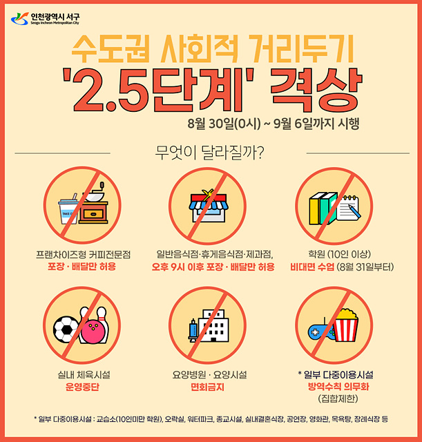 서구 재난안전대책본부는 오는 30일 0시부터 9월 6일까지 젊은 층,아동·학생,고령층 등 고위험 집단을 대상으로 '수도권 방역조치 강화에 따른 운영 제한 조치(8.30.~9.6.)’를 집중 전개한다.