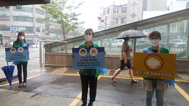 단체별로 홍보 효과를 극대화하기 위해 시도하는 아이디어도 눈에 띈다. 서구 새마을회에서는 비말(침방울)로 전파되는 코로나19 바이러스의 특성상 올바른 마스크 착용이 무엇보다 중요하다며 새마을지도자들이 참여해 방역수칙을 철저히 지키는 가운데 관내 곳곳에서 ‘마스크 제대로 착용하기’캠페인을 전개했다.