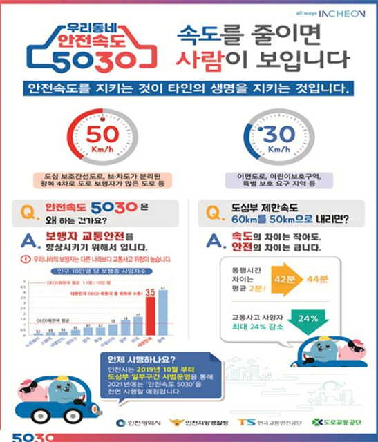 인천시는 2020년 12월‘안전속도 5030’을 전면 시행할 예정이며,전국적으로도 2021년 4월 이 정책이 확대 실시될 예정이다.