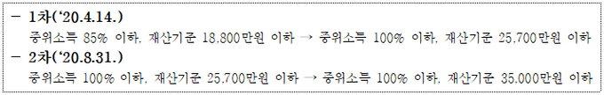 코로나19로 인해 소득이 25%이상 감소해 생계유지가 곤란한 위기가구에게 한시(1회)로 지급하고, 가구규모별 차등지급하는 생계지원형 급여로서, 4인 이상 가구기준 100만원(1인가구 40만원·2인가구 60만원·3인가구 80만원)을 지급한다.