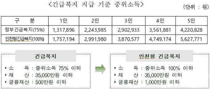 다만, 중위소득 75% 이하, 재산기준 35,000만원 이하에 해당된다면 보건복지부 긴급복지로 먼저 지원을 받게 되는데 지원내용은 인천형 긴급복지와 동일하다.