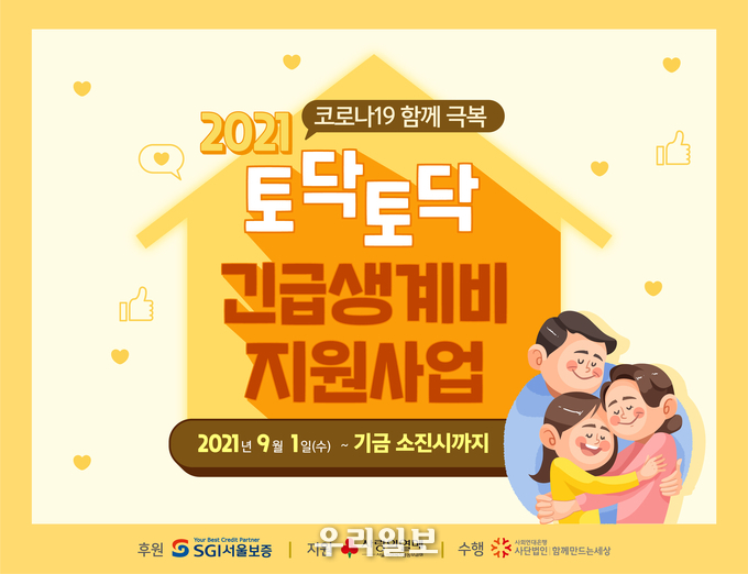 사단법인 함께만드는세상(사회연대은행)은 코로나19로 인한 실직근로자 또는 휴·폐업한 개인사업자 중 만 18세 이하 자녀를 둔 가정에 긴급 생계비를 지원하는 ‘2021년 코로나19 함께 극복 토닥토닥 지원금’ 사업을 이달 1일부터 실시한다.