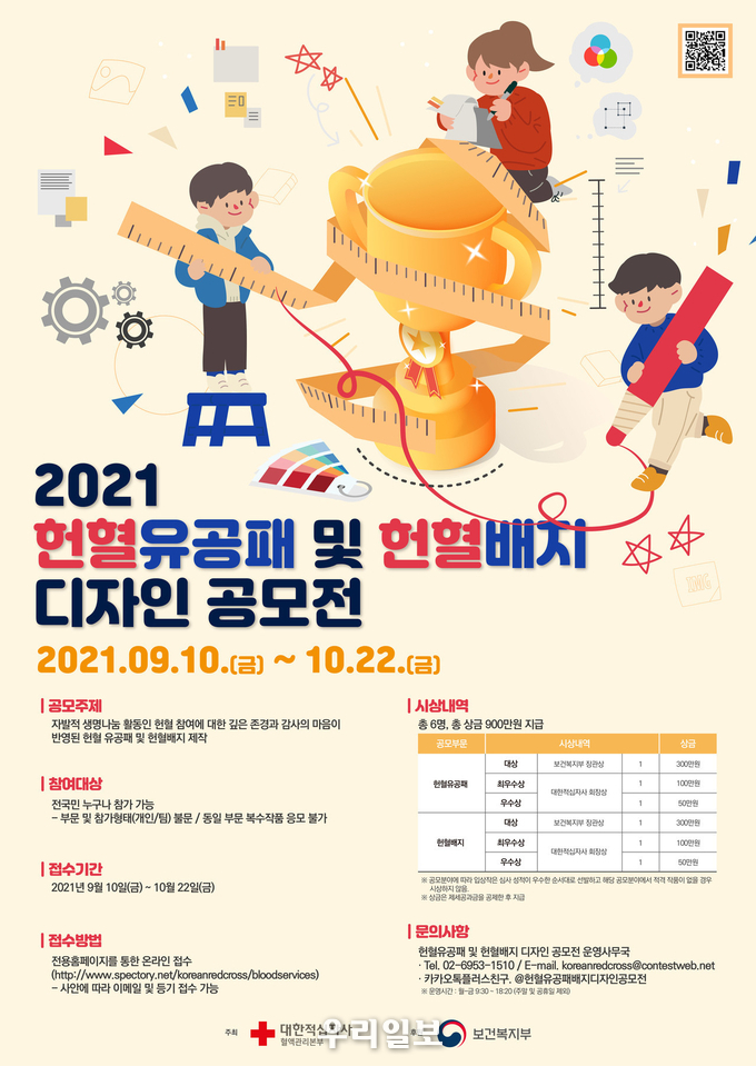 한편, 공모전을 통해 선정된 입상작은 향후 헌혈유공장 수상자 및 다회헌혈자를 위한 공식 상패와 부상품 제작에 활용될 예정이며, 접수는 공모전 홈페이지를 통해 가능하다. 기타 자세한 사항은 혈액관리본부 홈페이지 또는 공모전 운영사무국(☎02-6953-1510)을 통해 확인할 수 있다.
