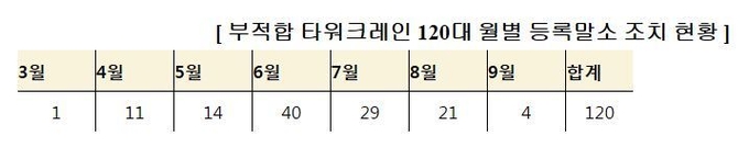 국토교통부는 지난 2월 타워크레인 120대를 대상으로 각 지자체에 등록말소를 요청하였지만 7개월이 지난 9월 15일에야 등록말소가 완료되었다.