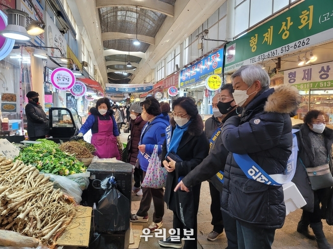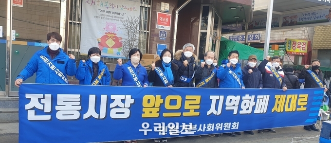 더불어민주당 이재명 대선후보 직속 기본사회위원회 인천 기본사회위원회가 23일 전국 광역위원회와 기초위원회가 동시에 참여하는 지역화폐 활성화 캠페인 ‘전통시장 앞으로 지역화폐 제대로’를 부평구 부평깡시장에서 진행했다.