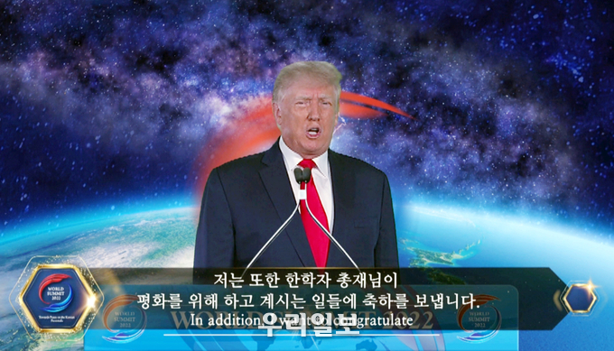 도널드 트럼프 전 미국 대통령은 기조연설에서 “세계평화 실현에 누구보다 앞장서서 헌신하는 한학자 총재께 감사하며 미국과 전세계 신앙의 자유와 진리를 수호하는데 공헌하는 워싱턴타임스를 고 문선명 총재와 함께 창립한 일에 감사한다”면서 “대통령 시절 한반도와 세계평화 실현을 목표로 지휘하게 돼 자랑스러웠으며 수십 년 동안 실패만 반복했던 사고방식을 버리고 외교적·군사적·경제적으로 전례를 찾을 수 없는 강경한 접근법을 썼다”고 회상하며 “4년 전 김정은 국방위원장과 저는 직접 만나서 북미 회담을 성사시킨 최초의 지도자가 됐는데, 그 당시 우리는 평화와 협력의 씨앗을 심었으며 이제는 꽃을 피우고 거대한 나무로 키워야 할 때이므로 기회를 날려버리는 것은 큰 비극”이라 안타까워했다.