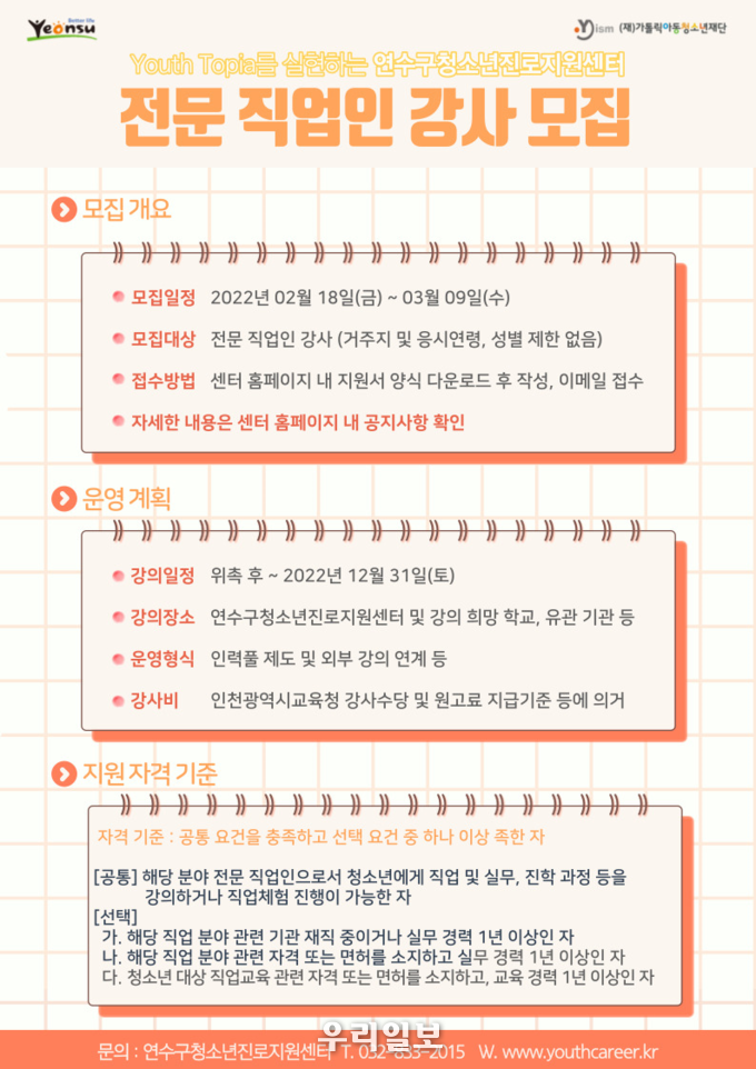 전문 직업인 강사 모집은 18일부터 다음달 9일까지 지원서를 연수구청소년진로지원센터 이메일로 제출하면 되며 소정의 절차를 걸쳐 선발된 인원은 연수구청소년진로지원센터의 전문 직업인 강사로 위촉돼 활동하게 된다.