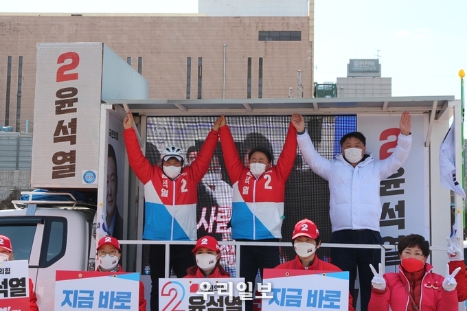 지난 5일 동구 송림로타리와 동인천역 북광장에서 이학재·이현웅위원장과 심재돈 국민의힘 지역구위원장이 함께 유세차에 올라 국민의힘과 국민의당은 정권교체를 목표로 원팀이 됐다며 서로 두 손을 맞잡고 합동 유세를 통해 윤석열 후보 지지를 호소했다.
