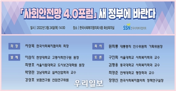 사회안전망 4.0 포럼이 24일 오후 2시 한국사회복지협의회 화상회의실에서 ‘새 정부에 바란다’라는 주제의 비대면 정책토론회로 열린다.