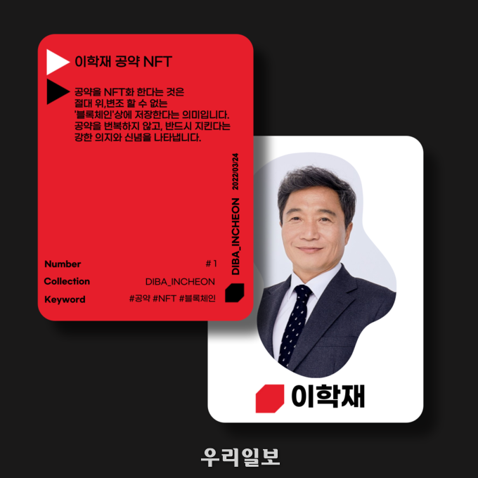 이학재 인천시장 예비후보는 “시민들께서 정치인에 대한 불신과 걱정이 크시다는 점을 잘 알고 있다”며 “시민들께 신뢰받고 책임지는 정치를 하기 위해서 공약사항을 NFT로 발행하기로 결심했다”고 강조했다.