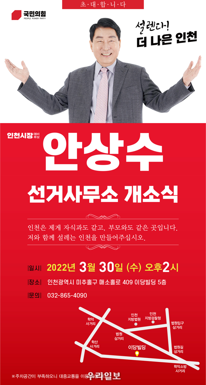 안상수 국민의힘 인천시장 예비후보가 30일 오후 2시 선거사무소 개소식을 연다.