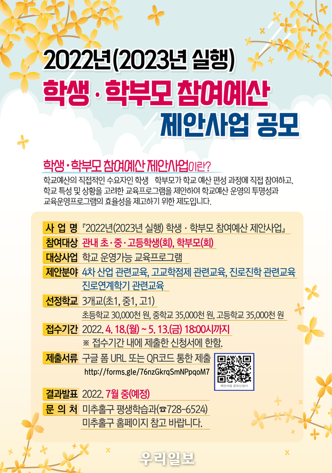 인천 미추홀구(구청장 김정식)는 2022년 학생·학부모 참여예산 제안사업을 공모한다.