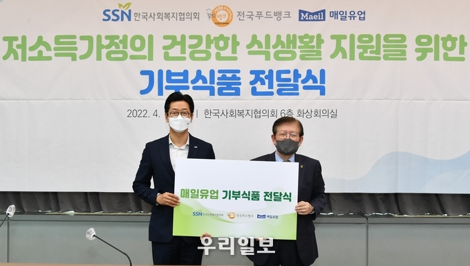 한국사회복지협의회 전국푸드뱅크(회장 서상목)와 매일유업(대표이사 김선희)은 지난 7일 서울 마포구 사회복지회관에서 저소득가정의 건강한 식생활 지원을 위한 기부식품 전달식을 가졌다.