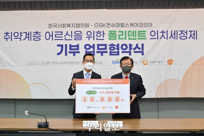 한국사회복지협의회(회장 서상목)와 GSK컨슈머헬스케어(대표이사 사장 신동우)는 23일 서울 마포 공덕동 사회복지회관에서 취약계층 노인을 위한 폴리덴트 의치세정제 기부 업무협약을 체결했다.
