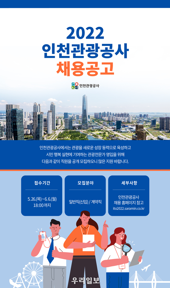 접수기간은 6월 6일 월요일 18:00까지이며 온라인으로 접수 가능하다. 자세한 응시방법은 인천관광공사 채용 홈페이지(ito2022.saramin.co.kr)를 참조하면 된다.