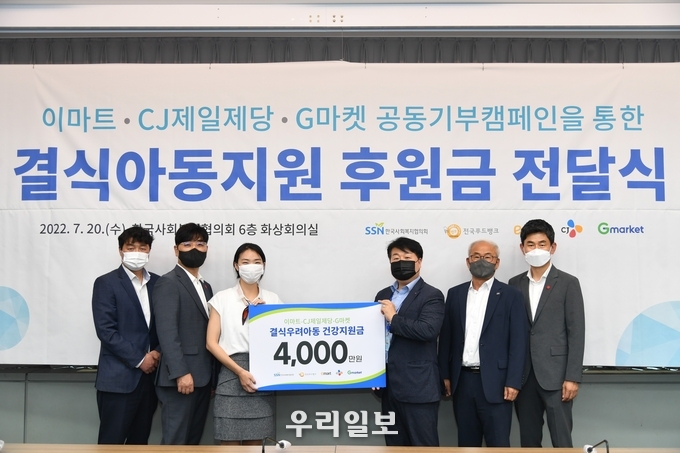 한국사회복지협의회 전국푸드뱅크(회장 서상목)는 지난 20일 서울 마포구 사회복지회관에서 이마트․CJ제일제당․G마켓 3사와 함께 결식아동지원을 위한 후원금 전달식을 가졌다.