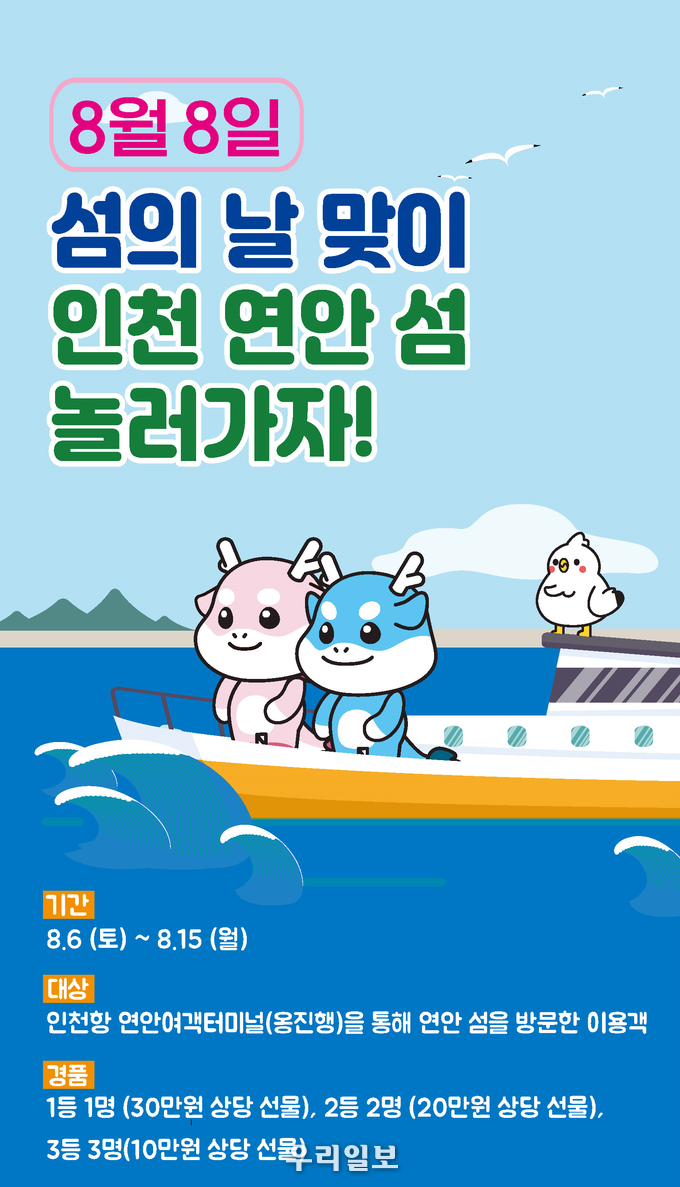 인천항 연안여객터미널(옹진행)을 이용하는 인천 연안 섬 여행 고객 대상 경품행사인 ‘인천 연안 섬 놀러가자’는 승선 전 개찰구 옆 엑스배너에 안내된 QR코드를 통해 참여 가능하며 추첨을 통해 총 6명에게 경품을 지급한다.