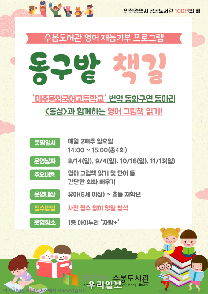 이번 달부터 새롭게 시작하는‘동구밭 책길’은 미추홀외국어고등학교 번역 동화구연 동아리 ‘동심’ 학생들이 영어 그림책 읽어주기, 책 속 단어 말하기, 간단한 회화 나눔 등을 진행 할 예정이다.