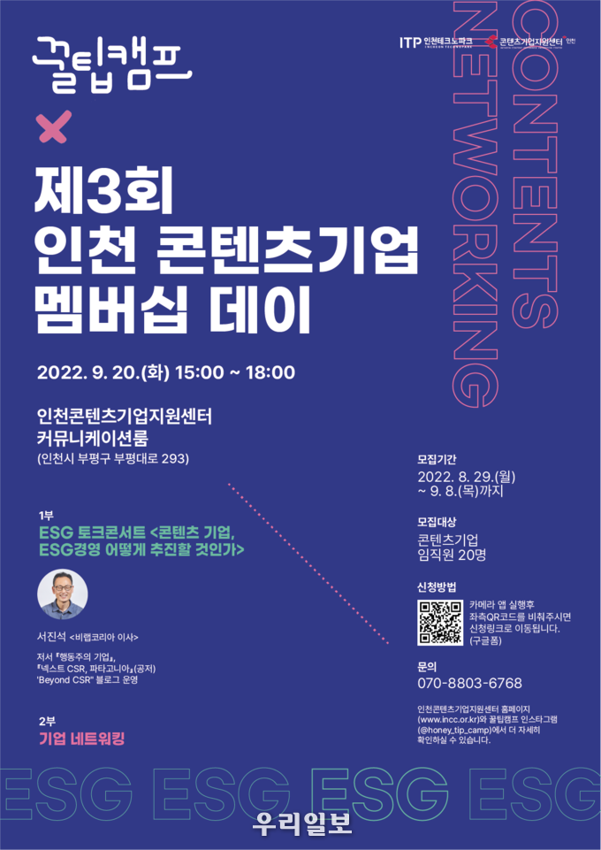콘텐츠기업의 ESG(환경·사회·지배구조) 경영 확산과 기업 간의 끈끈한 관계 형성을 도울 이번 행사는 다음 달 20일 오후 3시 인천콘텐츠기업지원센터(인천 부평구 부평대로 293 부평테크시티 9~10층) 9층 커뮤니케이션룸에서 열린다.