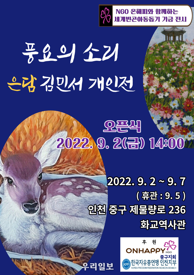 은담 김민서 작가가 세계빈곤아동돕기 기금마련을 위한 '풍요의 소리' 전시회를 UN NGO 온해피(배인식 회장)와 함께 다음달 2일부터 7일까지 한중문화관 별관 화교역사관 1층에서 개최한다.