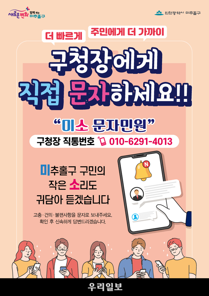 인천 미추홀구(구청장 이영훈)는 1일부터 인천시 최초 구청장 직통 문자민원 서비스 ‘미소 문자민원’을 시행한다.