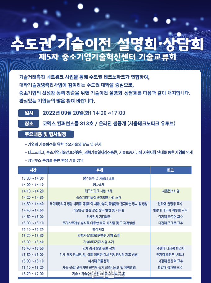 출품기술 등 행사와 관련한 자세한 내용은 수도권 기술이전 설명회 누리집을 참조하면 된다.