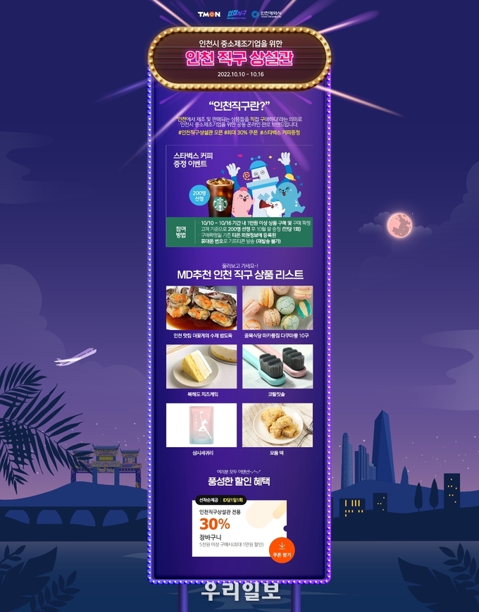 인천지역 중소 제조기업과 소상공인의 제품을 판매하는 인천직구가 오는 16일까지 국내 대형 온라인장터 티몬 온라인상설관 오픈 기념행사를 벌인다.