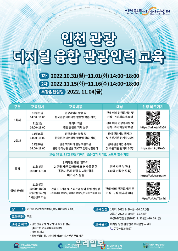 인천관광공사(사장 직무대행 유시경)는 인천의 관광·마이스 전문 인력 양성을 위해 인천 관광 디지털 융합 관광인력 교육과 인천 MICE 분야별 역량강화 교육을 오는 28일부터 다음달 29일까지 진행한다고 밝혔다.