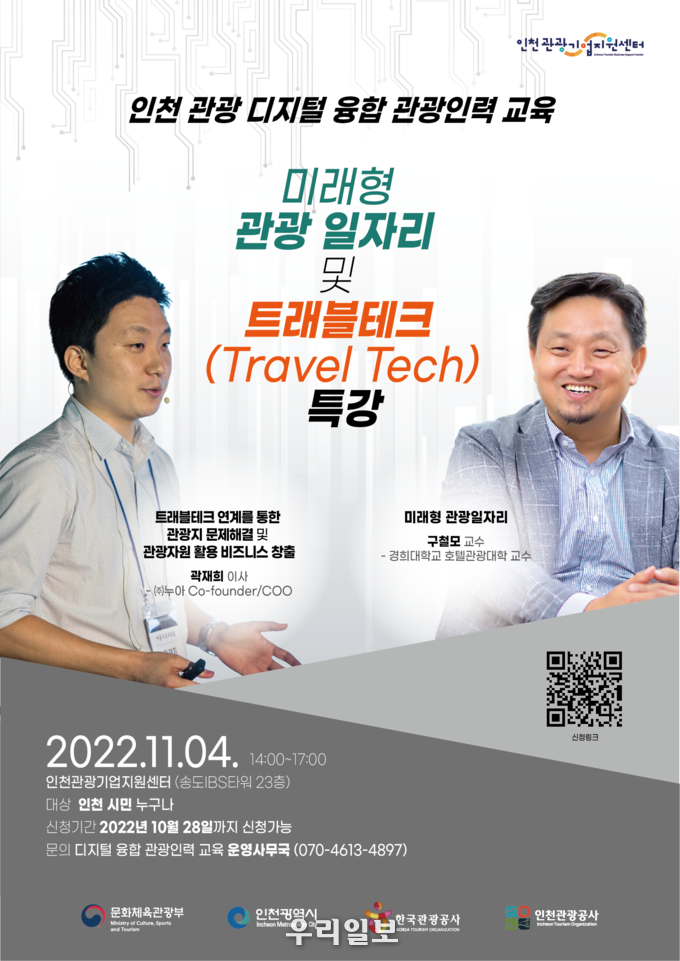 아울러 인천 시민을 대상으로 미래형 관광일자리와 트래블테크의 이해를 도울 특강(11월 4일)과 인천 관광 분야 취업을 준비하고 있는 예비 관광종사자를 대상으로 현직자 멘토링 등 취업 컨설팅(11월 4일)이 함께 제공될 예정이다.