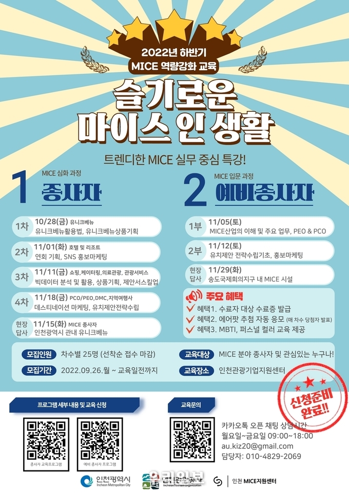 한편 교육 신청에 대한 자세한 사항은 인천관광기업지원센터와 인천마이스지원센터 홈페이지를 통해 각각 확인할 수 있다.