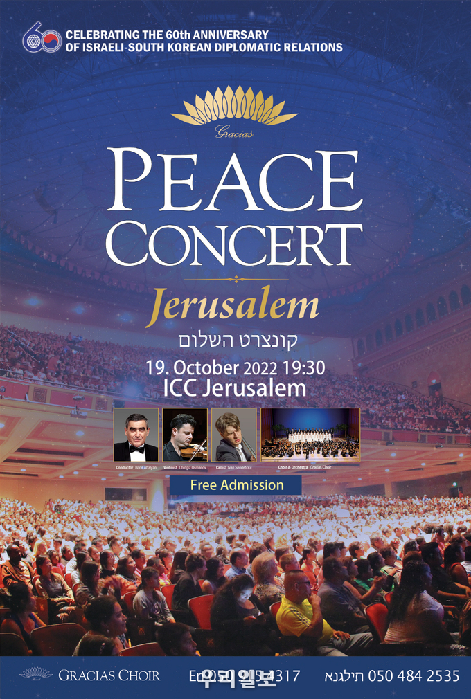 한-이스라엘 수교 60주년을 기념해 열린 이번 콘서트에는 세계 최정상의 그라시아스합창단과 지휘자 보리스 아발랸, 바이올리니트스 칭기즈 오스마노프, 첼리스트 이반 센데스키 등 최정상의 음악가들이 클래식 명곡들과 함께 이스라엘 음악을 선사했다.
