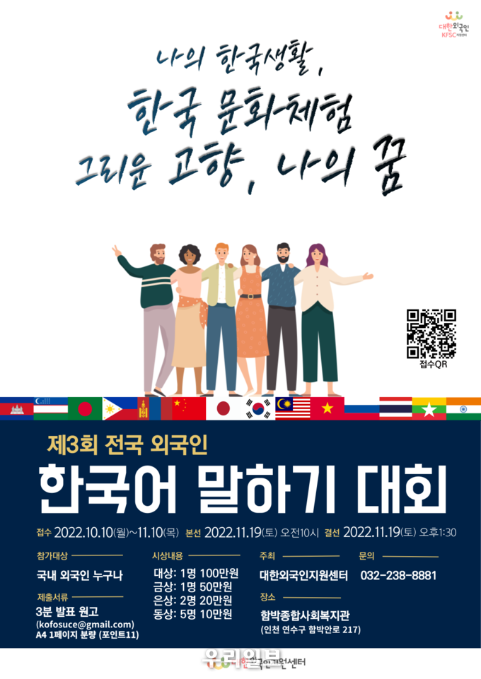 대한외국인지원센터는 오는 19일 함박종합사회복지관에서 제3회 전국 외국인 한국어 말하기 대회를 개최한다.